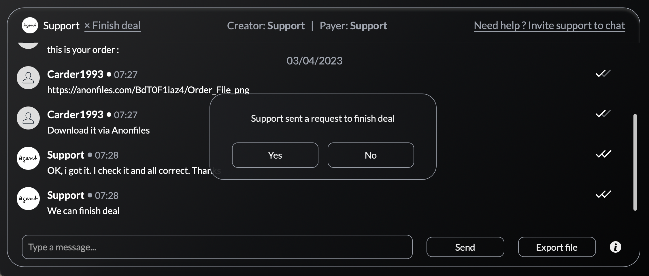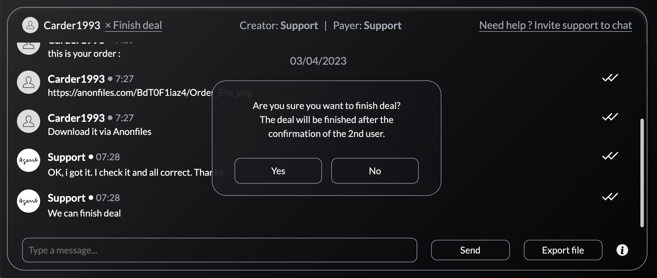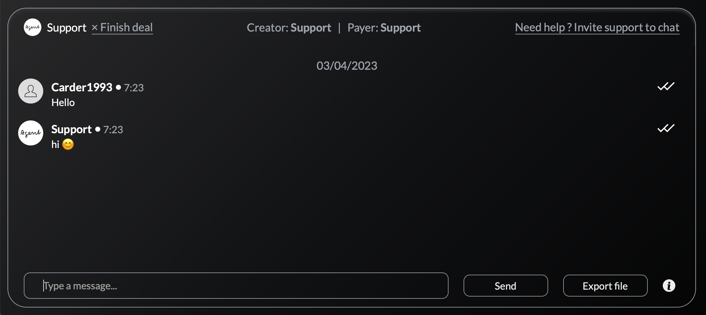 Creator - the user who created the deal. Payer - the user who pays for the items/services. Finish deal - the button to finish the deal. Need help? Invite support to chat - the button to add the arbitrator in the chat in case of disputes.