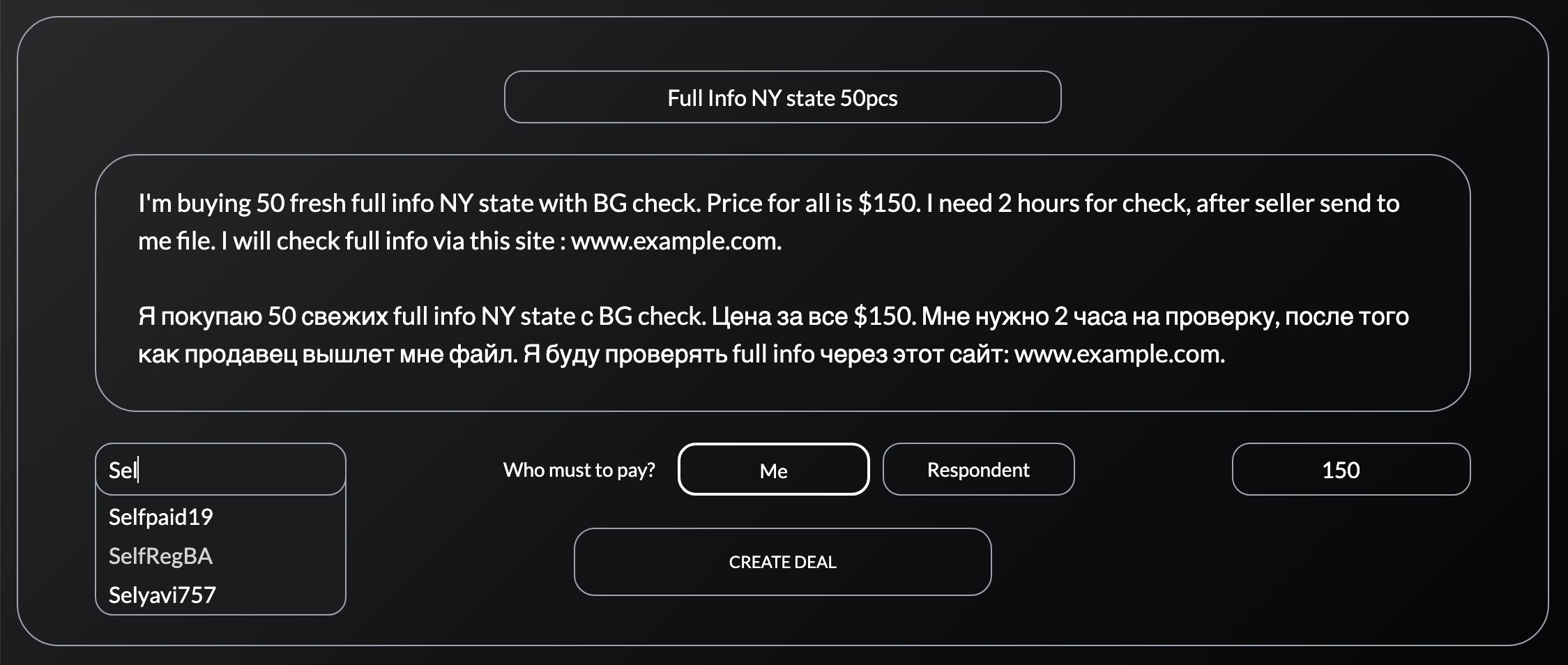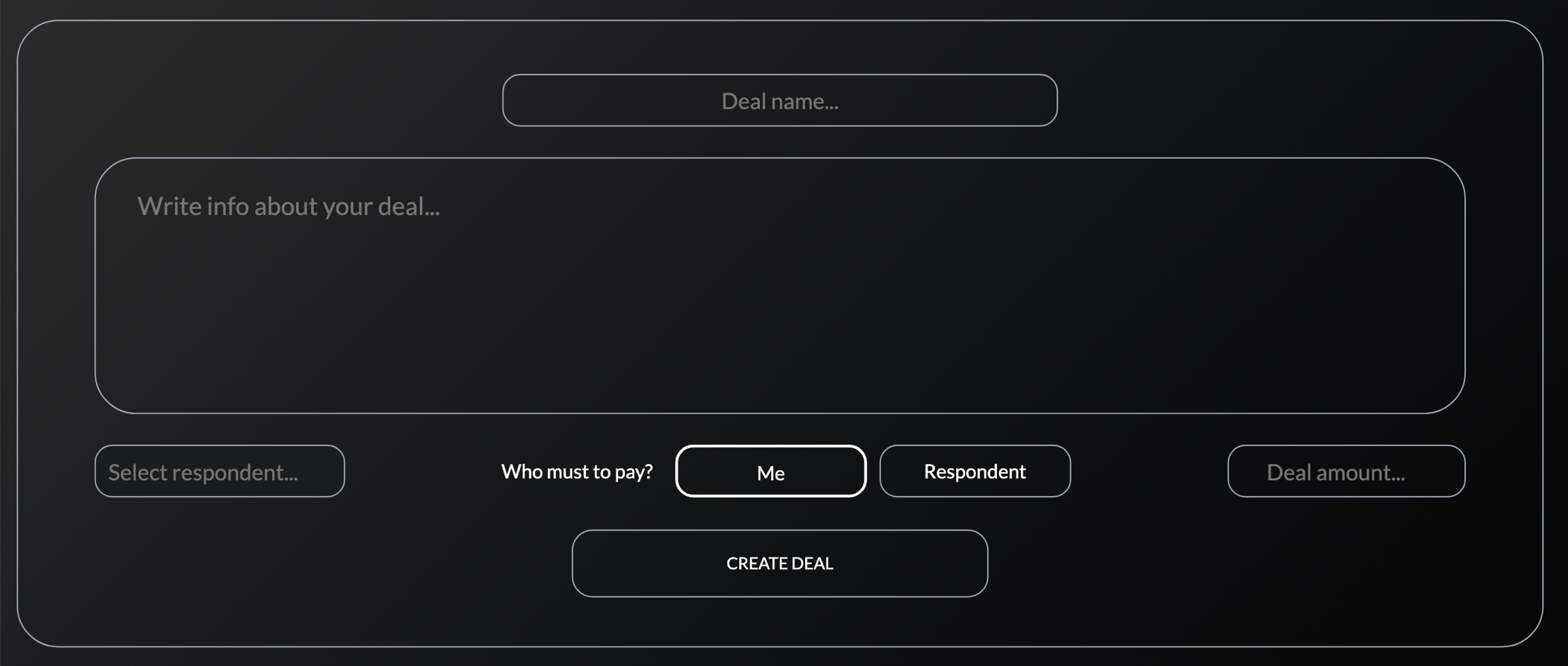 Deal name - Name of the deal Write info about your deal - Detailed description of the deal (Terms/Time to check/additional nuances) Select respondent - Select the opponent, with whom we want to conduct the deal Who must to pay ? - Select the user who will pay for the service/item (0% transaction fee) Me - If you are buyer Respondent - If you are seller Deal amount - The amount of the deal