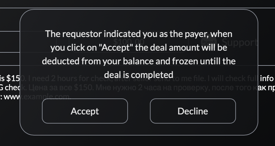 If payment will be for the user who accepts the transaction, an additional window will pop up informing you that the transaction amount will be charged and frozen until it is completed. If you don't have enough money to approve the transaction, top up your internal wallet balance.