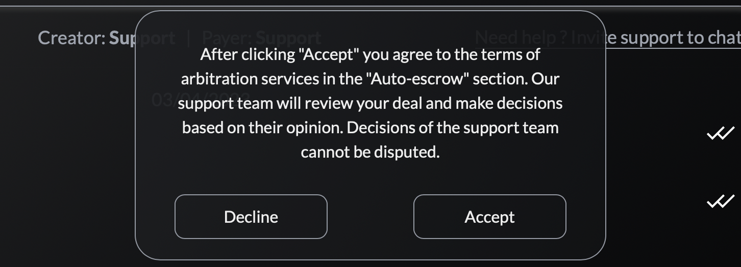 7. When you add an Arbitrator to the chat, a message will pop up, as in the screenshot below. It means that the Arbitrator decides the fate of the deal and the Arbitrator's decision cannot be disputed, as well as the Arbitrator charges % from the deal for his work. Read more about the work of the Arbitrator in the rules of Auto-escrow at the link: https://styxmarket.com/escrow/terms.