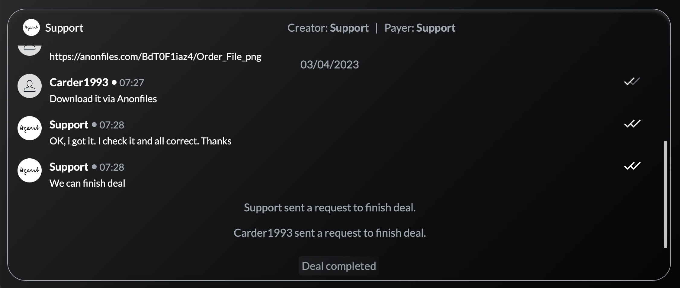 6. Open the deal. Here is the chat between the buyer and the seller. At the top we see information about the deal :